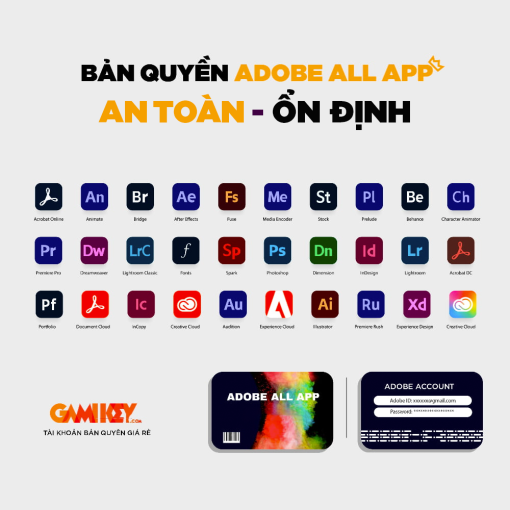 Qua thời gian hoạt động dài đảm bảo được độ uy tín cao Gamikey cũng đã trở thành một nơi chuyên cung cấp các loại tài khoản nền tảng số. Với chất lượng cao và giá bán thấp nhất bạn có thể mua Adobe bản quyền gói Creative Cloud All Apps chỉ sau vài thao tác đơn giản như: